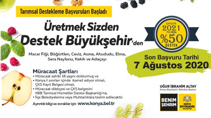 Büyükşehir, Konyalı üreticiye bu yıl, “Macar Fiği, böğürtlen, ceviz, asma, ahududu, elma, sera naylonu, kekik ve adaçayı” desteğinde bulunuyor. Müracaat etmek isteyen çiftçilerin dilekçelerini Konya Büyükşehir Belediyesi’ne, ilçe belediyelerine veya mahalle muhtarlarına teslim etmesi gerekiyor. Konuyla ilgili ayrıntılı bilgi ve başvuru dilekçesine www.konya.bel.tr adresinden ulaşılabiliyor.