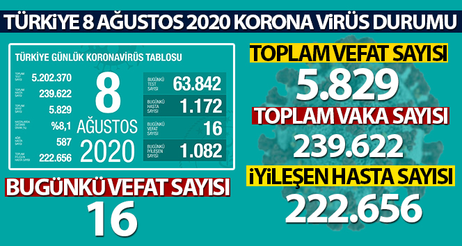 Sağlık Bakanı Fahrettin Koca, sosyal medya hesabından Türkiye'nin güncel korona virüs tablosunu kamuoyu ile paylaştı. Tabloya göre, son 24 saatte 16 kişi korona virüsten hayatını kaybetti, toplam can kaybı ise 5 bin 829'e yükseldi. Bugün toplam 63 bin 842 test yapılırken, bin 172 yeni vaka tanısı konuldu. Toplam vaka sayısı 239 bin 622 oldu. Bugün iyileşen bin 82 kişiyle birlikte toplam iyileşen hasta sayısı da 222 bin 656'e yükseldi. Toplam hastalarda zatürre oranı yüzde 8,1, toplam ağır hasta sayısının ise 587 olduğu açıklandı.